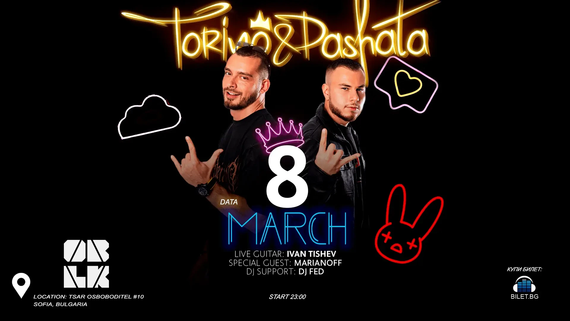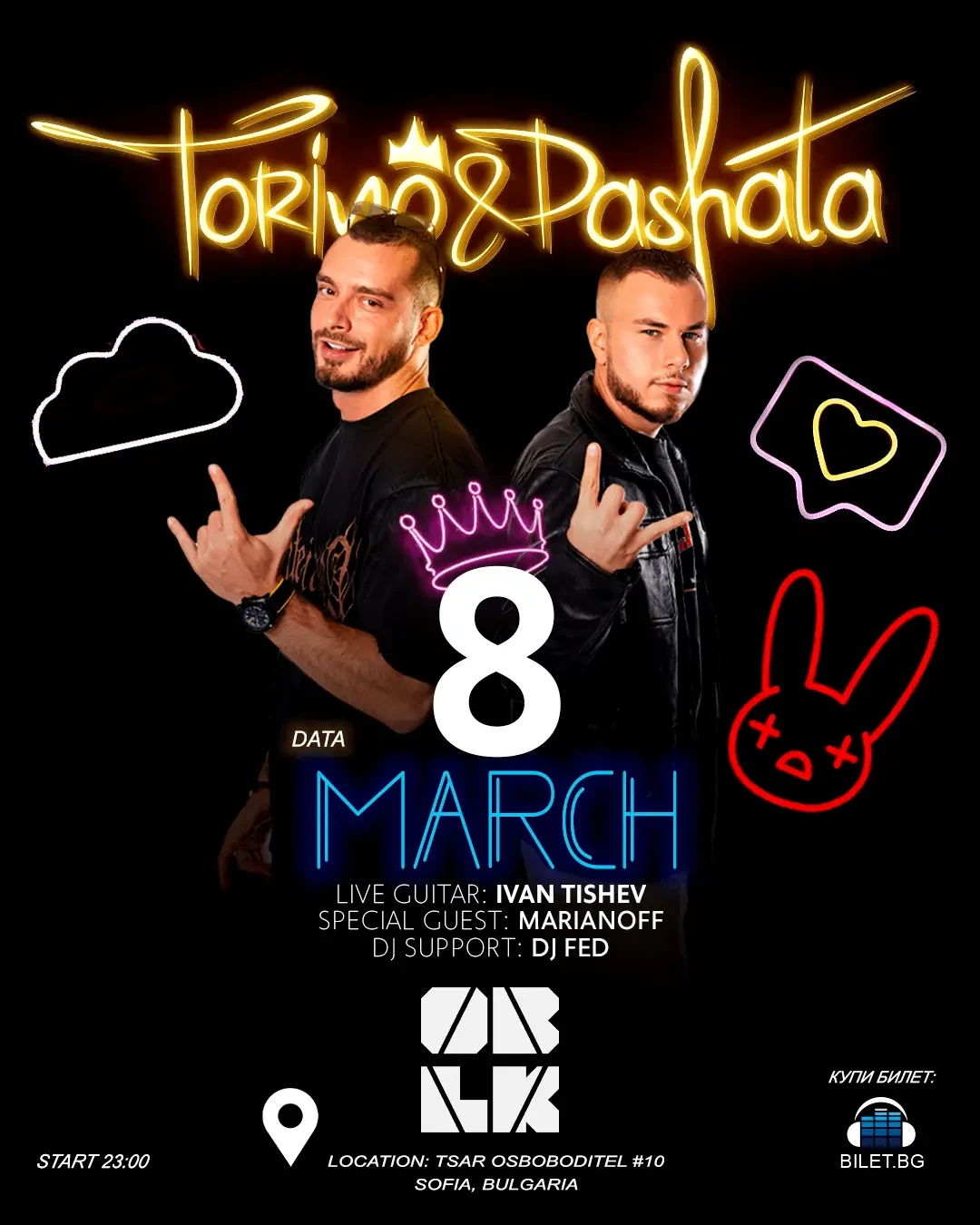 На 8 март, от 23:00 ч., Torino & Pasha ще разтърсят сцената на ул. „Цар Освободител“ №10 с уникална комбинация от музика и енергия, която не можете да пропуснете!