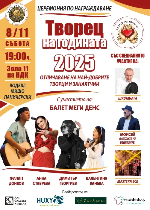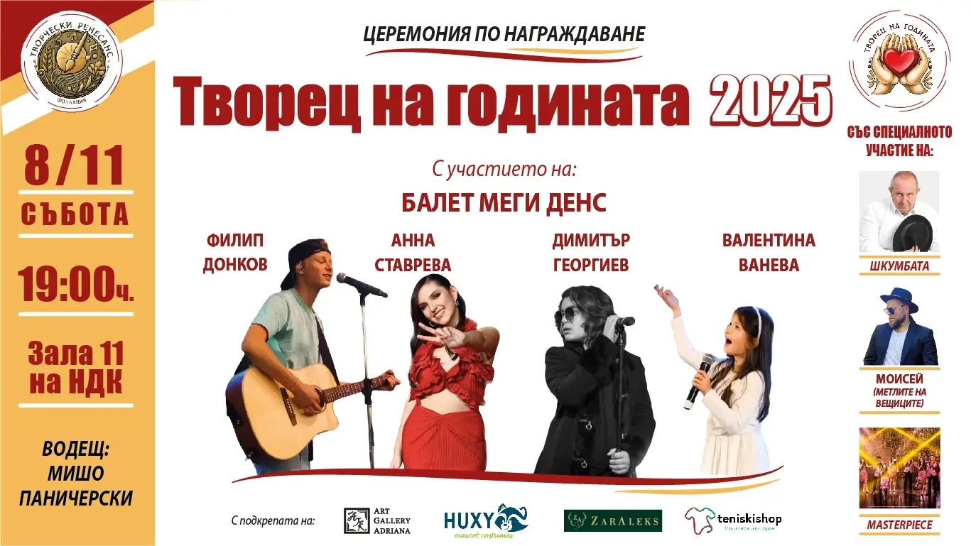 Церемонията „Творец на годината“ е празник на българския творец на ръчно изработени творения – пазител на традициите и съхранител на нашата национална идентичност. За трета поредна година това събитие събира майстори от цялата страна, които със златните си ръце превръщат материалите в изкуство, а труда – в красота и вдъхновение.