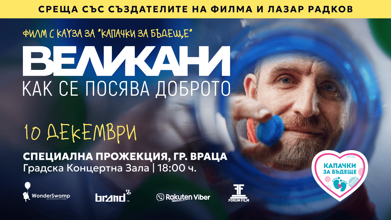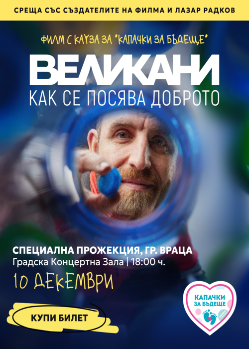„Великани“ е пълнометражен документален филм, който проследява историята на Лазар Радков и хилядите доброволци зад инициативата „Капачки за бъдеще“. Филмът е не просто кино заглавие, а движение с кауза. Всеки закупен билет допринася за изграждането на национална мрежа от пунктове за първа долекарска помощ чрез поставяне на автоматични външни дефибрилатори (AED) в големите български училища.