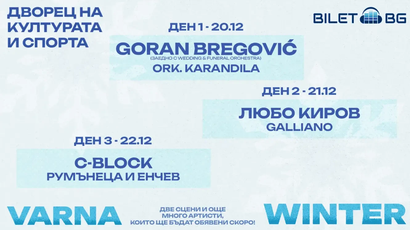 От 20 до 22 декември 2025 г. Зала Конгресна в Двореца на културата и спорта ще обедини цяла Варна с първия по рода си за града фестивал. Очакват ви две сцени, артисти от най-високо световно ниво, фестивални активности и много изненади, които ще превърнат изживяването ви в незабравим спомен.